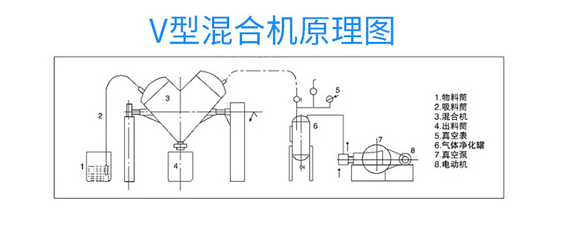 V型混料機一端裝有電機與減速機,電機功率通過皮帶傳給減速機,減速機再通過聯軸器傳給V型桶。使V型桶連續運轉,帶動桶內物料在桶內上、下、左、右進行混合。