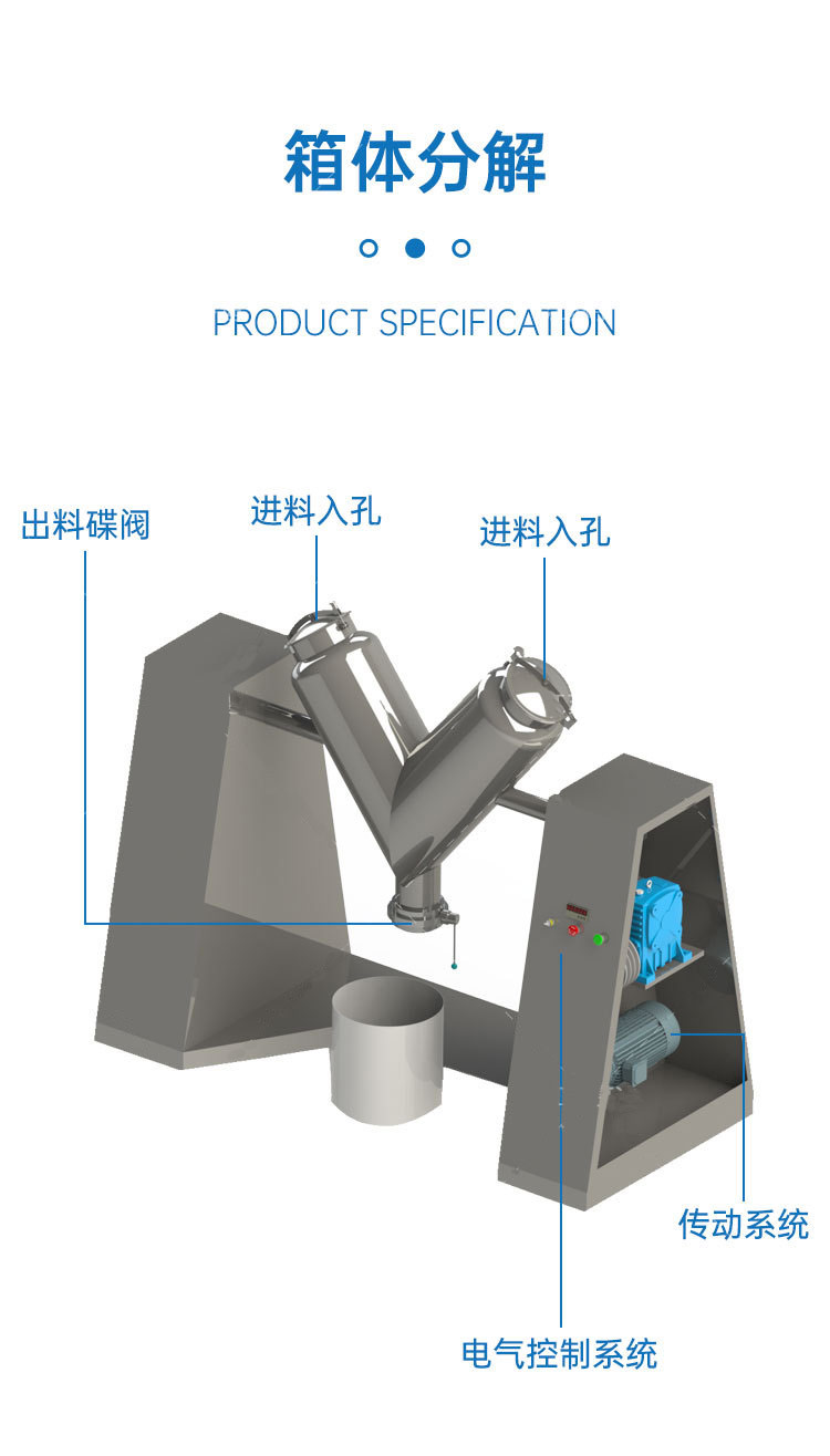 V型混料機為高效不對稱混料機,它適用于化工、食品、醫藥、飼料、陶瓷、冶金等行業的粉料或顆粒狀物料的混合。該機混合桶結構獨特,混合均勻,效率高,不積料,操作密閉,進出料方便,外表面和物料接觸部分均采用不銹鋼制造,造型美觀,維護、清洗方便。