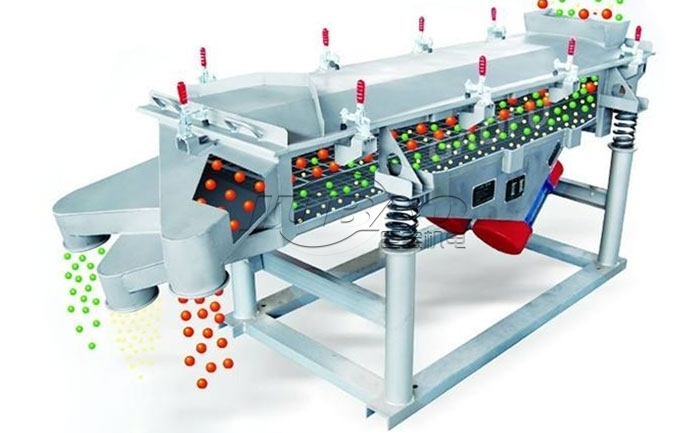 直線篩是雙振動電機驅動,當兩臺振動電機做同步、反向運轉時,其偏心塊所產生的激振力在平行于電機軸的方向相互氏消,在垂直于電機軸的方向疊為一合力,因此物料在直線篩機上的運動軌跡為直線向前做拋物線運動,兩電機軸相對篩面有一傾角在激振力和物料自重力的合力作用下物料在篩面上被拋起跳躍式向前作直線運動,從而達到對物料進行篩選和分級的目的。